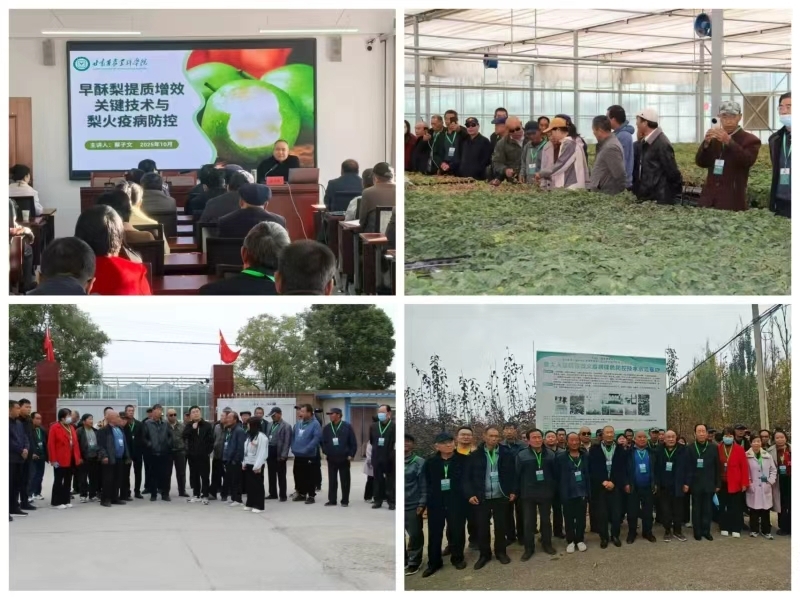站(场)党委书记、站(场)长蔡子文受邀为全体学员作了《早酥梨提质增效关键技术与梨火疫病防控》的专题培训。相关负责人向学员们讲解了站(场)概况、职能职责、产业培育、对外合作交流等情况,在场技术人员为学员们详细讲解了梨园病虫害防治、水肥调控、果树整形修剪等果园管理技术知识,重点讲授了梨火疫病的起源、发病原因、传播方式等内容。